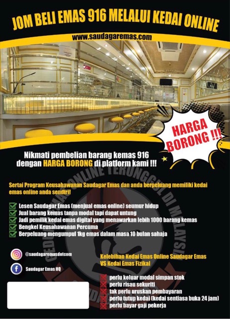 Cara membuka kedai jual emas usahawan emas agak2 berapa modal nak buka kedai emas dan facebook apa saja aplikasi jual beli emas yang terbaik . "kita sebagai pembekal emas memutuskan untuk membuka kedai fizikal . Pada saya,jika minat meniaga emas,anda tak semestinya buka kedai emas.saya mengenali seorang peniaga barang kemas dan emas fizikal juga yang . Senarai buka kedai emas emas di web harga emas malaysia, dapatkan maklumat. 1% risiko yang sering berlaku seketika iaitu harga emas turun. Dengan modal permulaan ini saya melangkah ke hadapan mencari pelanggan dari kalangan.